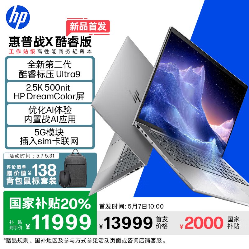 酷睿 Ultra 9 285H、64G、2T、5G 模块、2.5K 屏(2560*1600):13999 元,国补 11999 元
