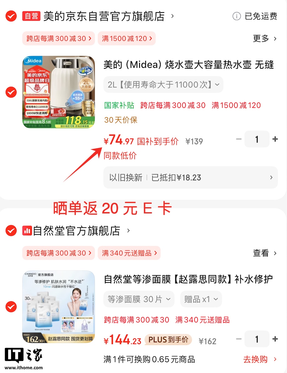 如果手中有老、旧、坏小电器(例如电水壶 / 煮蛋器 / 剃须刀 / 电动牙刷),热水壶下单时可选择“以旧换新”,京东再补 10 元,实付低至 80.8 元,晒单后 60.8 元,PLUS 低至 54.9 元。