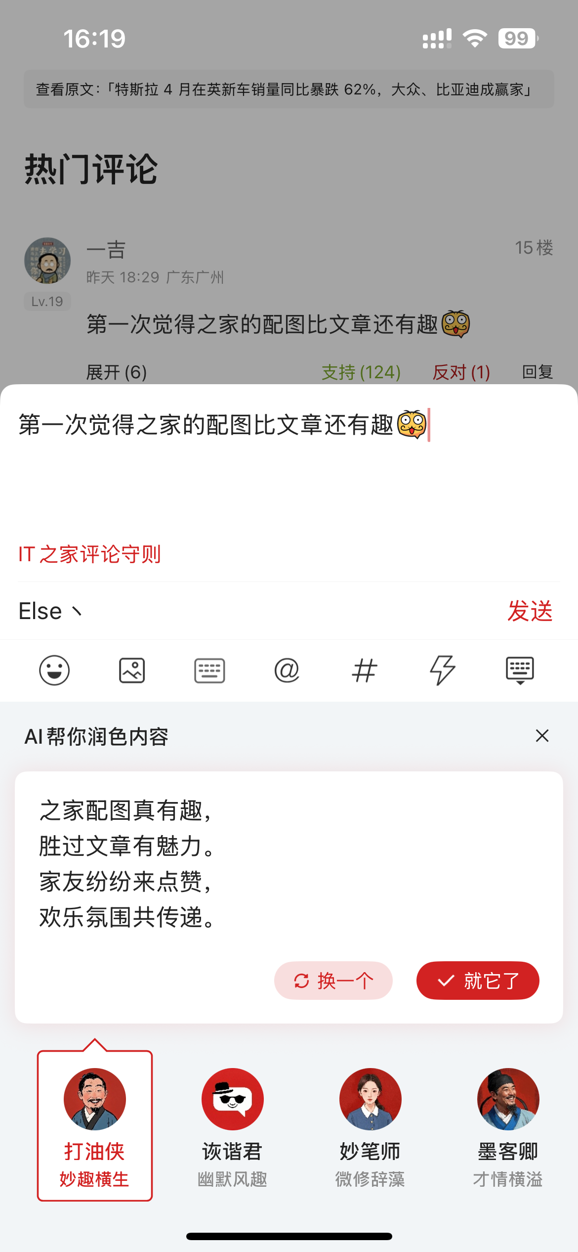 新增:功能 - AI 帮你「润色评论内容」,多种嘴替任你选