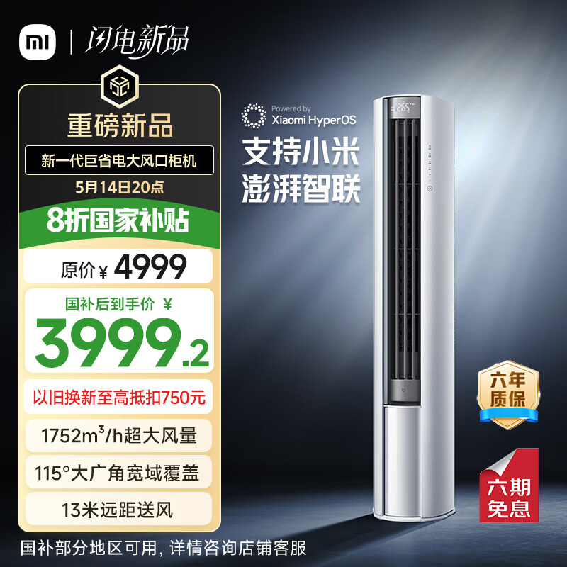 IT之家 5 月 8 日消息,小米米家空调巨省电立式 3 匹新一级能效上市,原价 4999 元,国补价 3999.2 元,5 月 14 日 20:00 开售。
