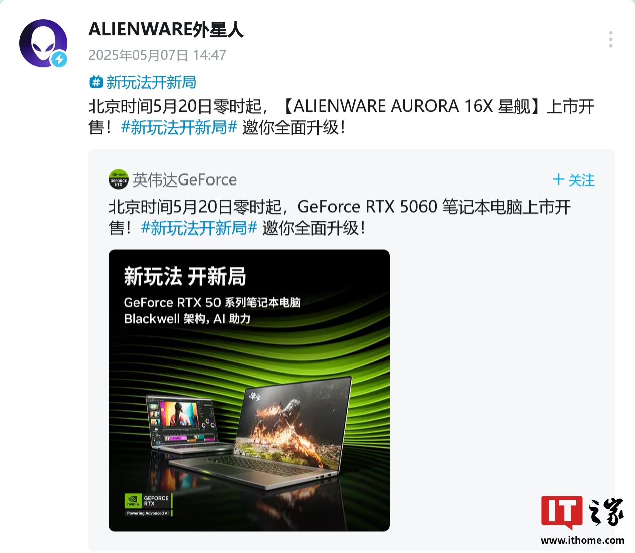 从转发的英伟达 GeForce 动态来看,AURORA 16X 游戏本预计将配备 GeForce RTX 5060 笔记本电脑 GPU。