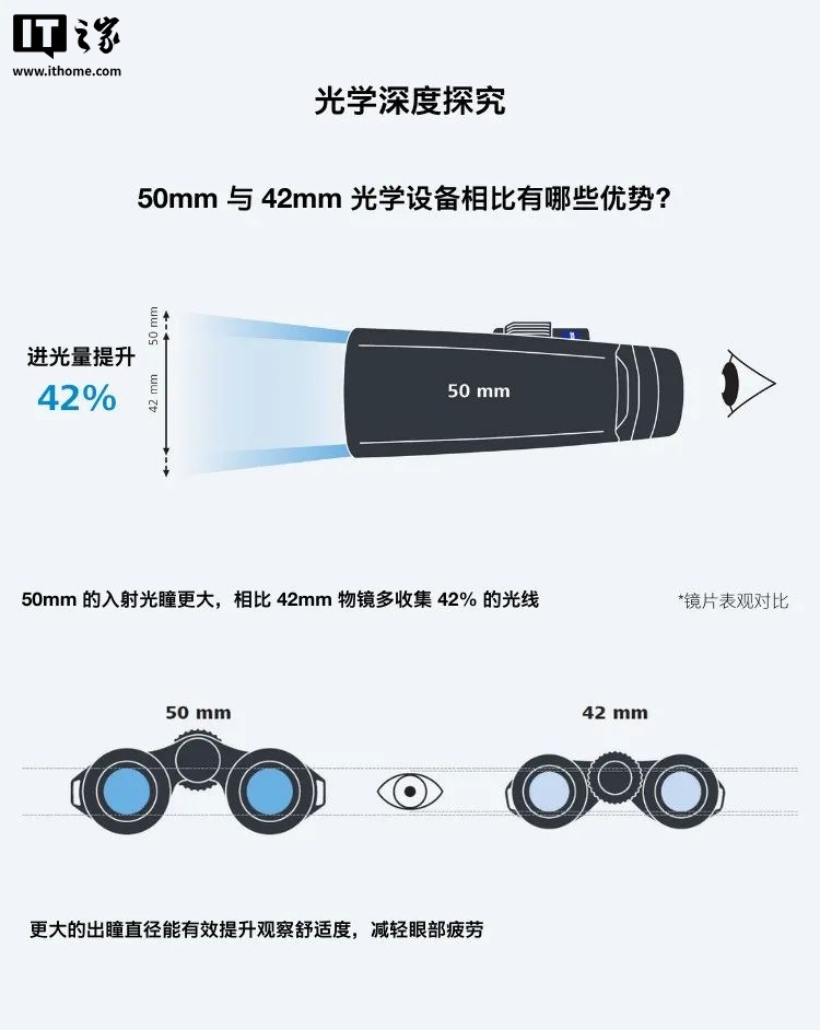 蔡司 SFL 50 搭载镁金属外壳,减小了镜片直径和厚度,从而实现紧凑设计,视野最高可达 131 米、最近对焦距离 1.8 米;采用 50 毫米物镜,相比 42 毫米物镜多收集 42% 的光线。
