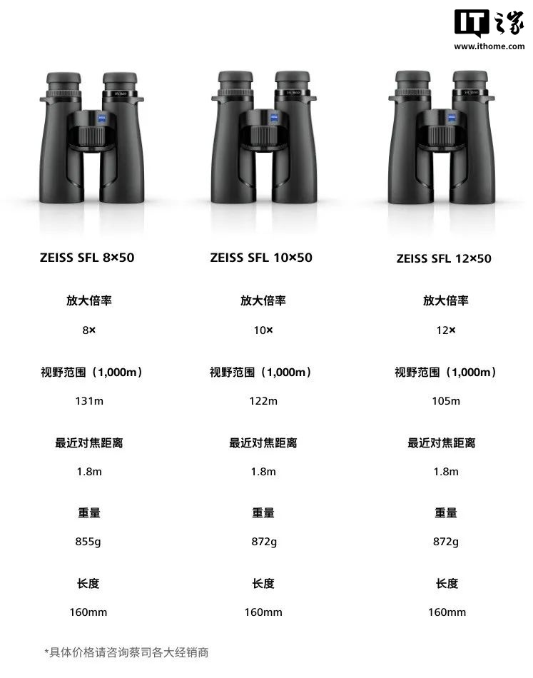 蔡司 SFL 50 双筒望远镜可选 8x、10x、12x 放大倍率三个版本,IT之家附参数表如下: