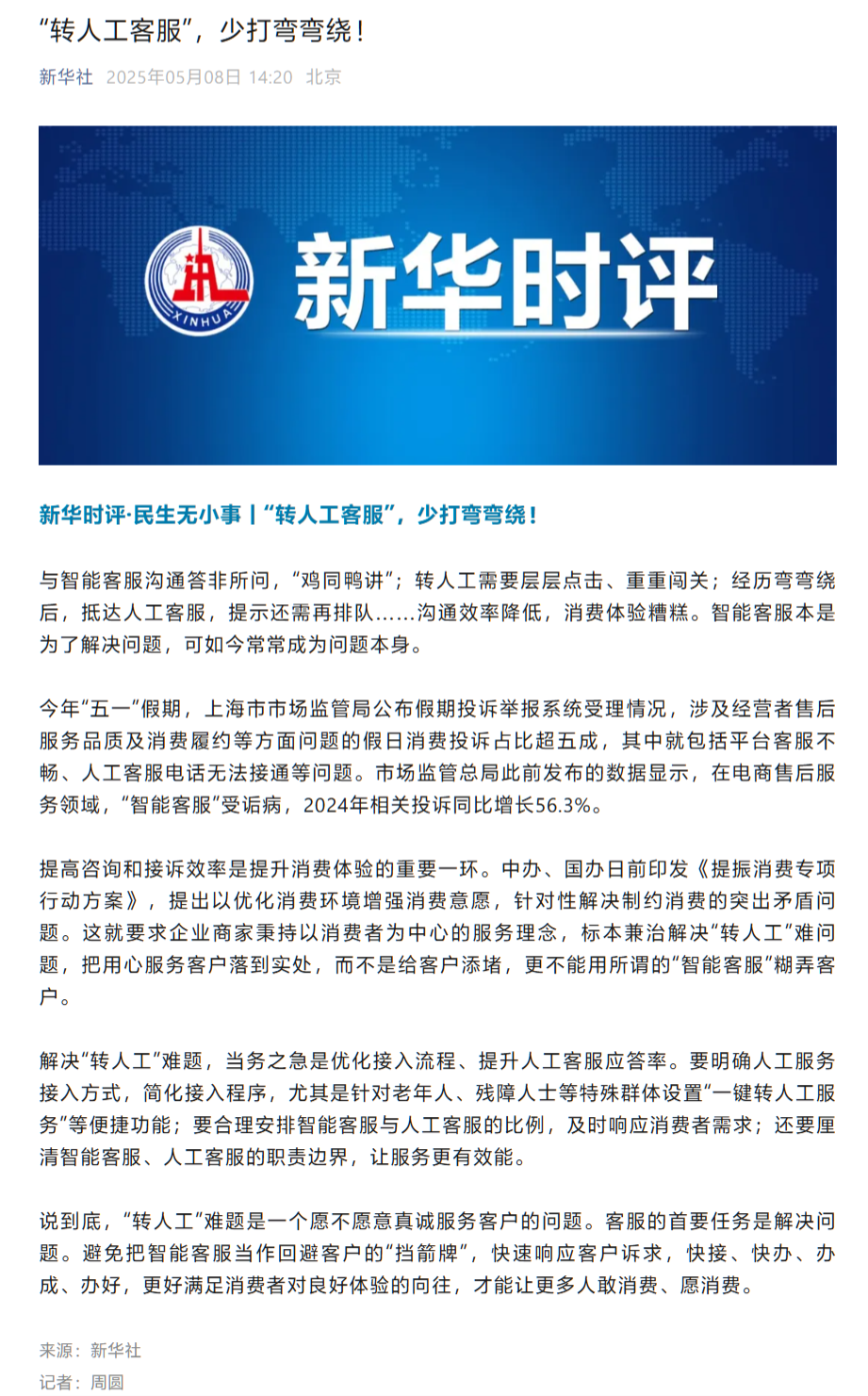 IT之家 5 月 8 日消息,新华社“新华时评”栏目今日刊发《“转人工客服”,少打弯弯绕!》文章指出,本是为了解决问题的智能客服,如今却常常成为问题本身。