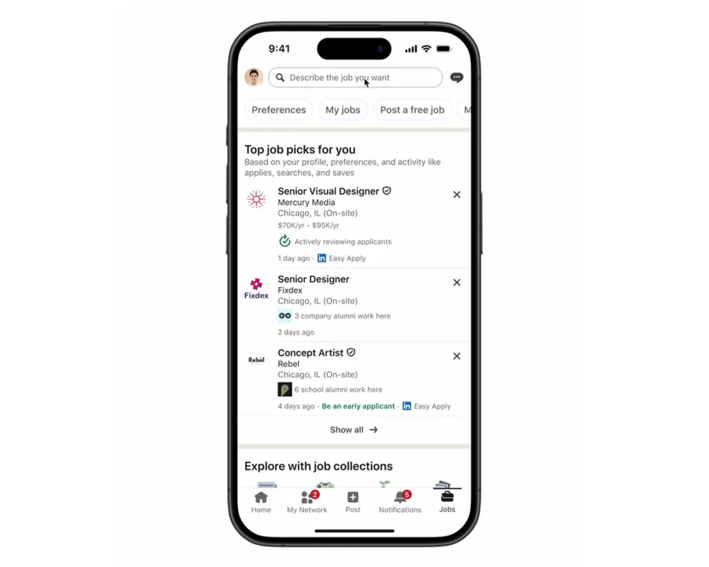 新功能包括一个基于自然语言处理的职位搜索功能。职位搜索主要依赖关键词,可能会有一些职位因为没有匹配的关键词而无法显示。而新的 AI 搜索功能能够理解自然语言,并根据你的背景推荐你可能符合的职位,即使职位描述中没有直接提到相关关键词。