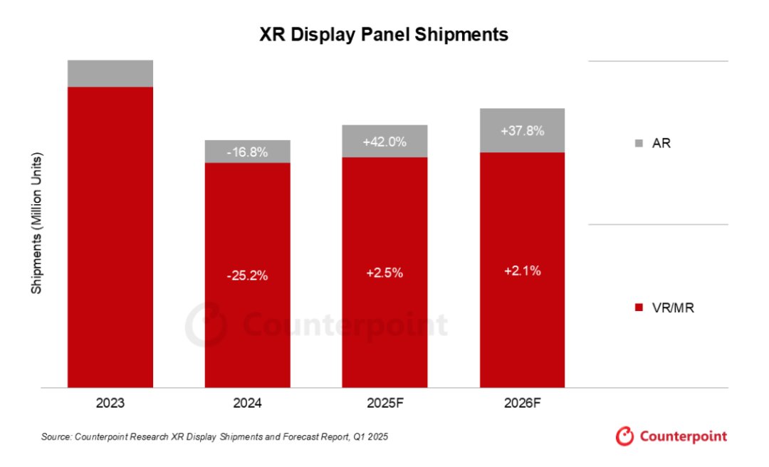 IT之家 5 月 8 日消息,根据 Counterpoint Research 最新《XR 显示器出货量与预测报告》,2025 年全球 XR(AR / VR)显示器出货量预计同比增长 6%。