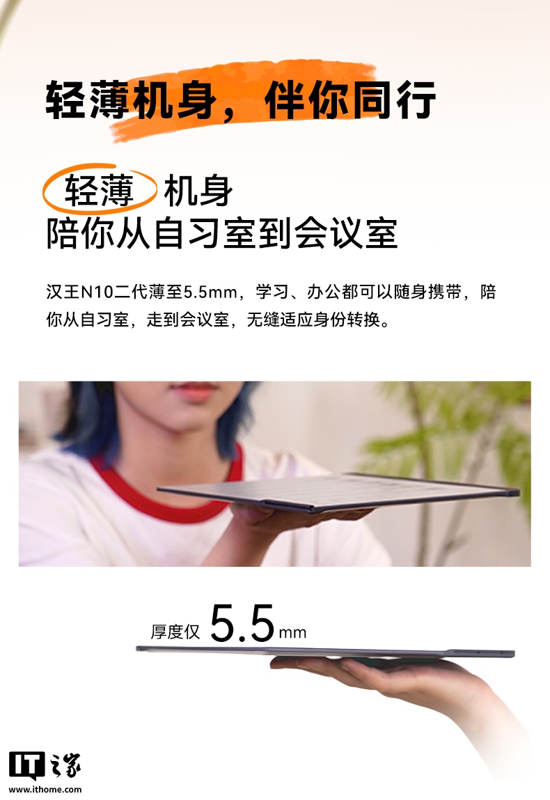 减屏层设计是 N10 的一个显著标志,如今在 N10 二代上也得以延续,屏层厚度减少 31%,透光性成倍增加,显示对比度也提升 21%。得益于减屏层设计,N10 二代在升级为 6500mAh 电池后,依然将整机厚度控制到 5.5mm,保持了绝佳的手持握感和操作体验。
