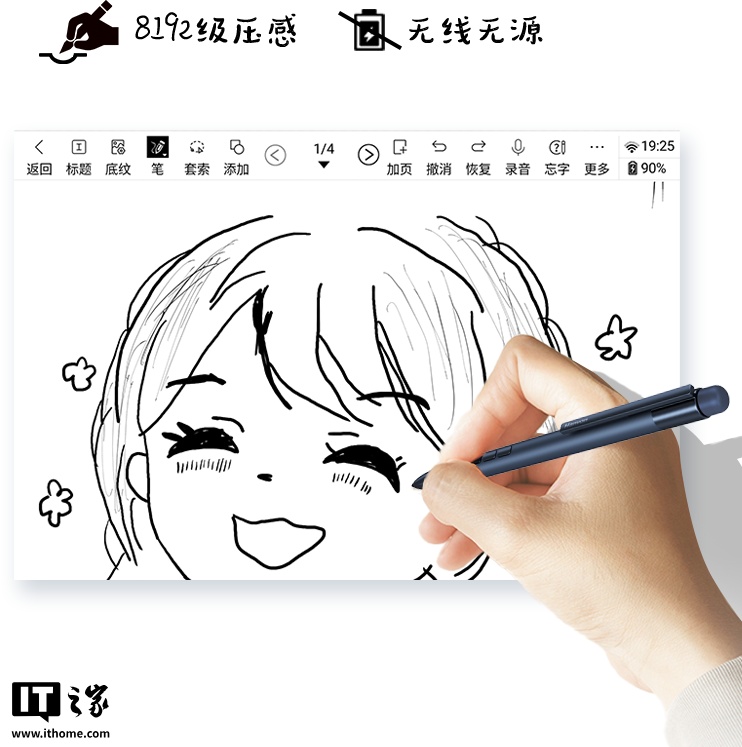 N10 二代标配数字式 B6 无线无源电磁笔,金属笔身让握感更富质感,同时 8192 级压感带来笔尖更细腻的变化。B6 无线无源电磁笔支持笔尾橡皮擦功能,同时笔身前侧设置了三个快捷按键,可以自定义笔尖切换、橡皮擦和模拟手触等快捷操作。