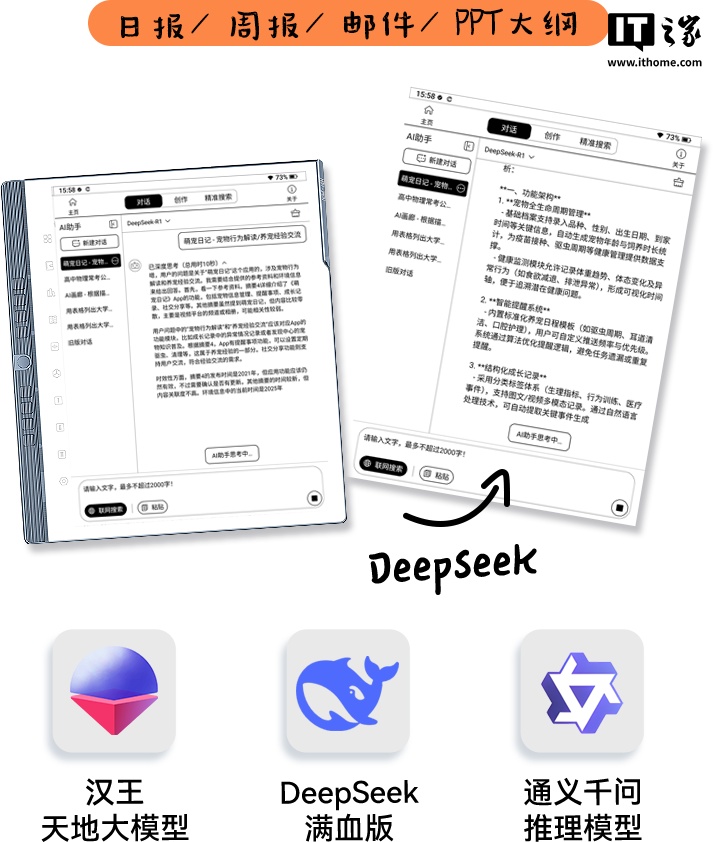 在大模型能力层面,N10 二代内置 AI 助手,搭载汉王自研的天地大模型,优化了对话、写作、会议纪要、精准检索等 AI agent 智能体验;接入 DeepSeek 满血版 R1 和 V3 模型并支持联网搜索,还接入了通义千问-QWQ-32B 推理模型。