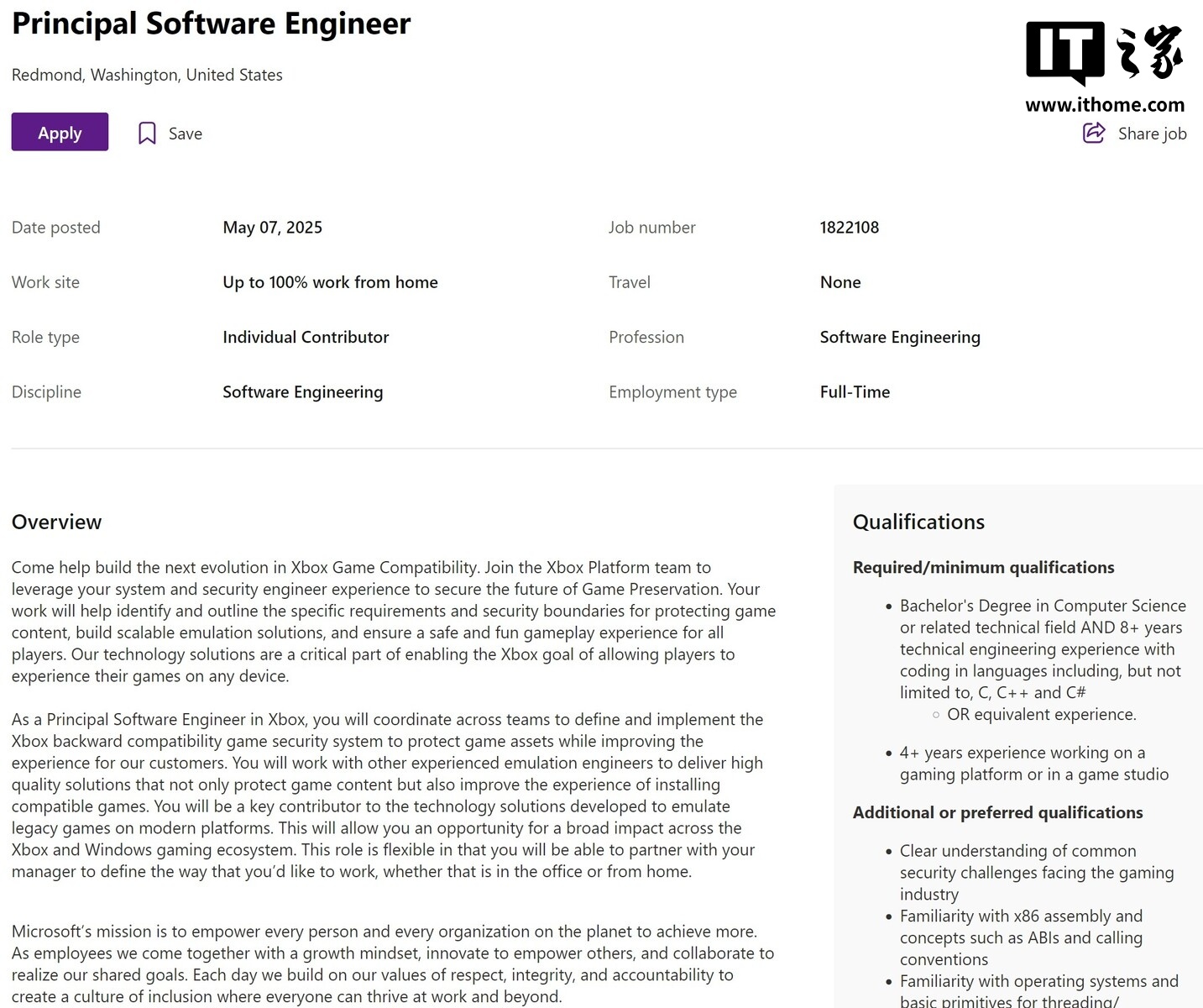 IT之家 5 月 8 日消息,昨日的招聘信息显示,微软正在招募首席软件工程师以强化 Xbox 经典游戏的保护工作,未来 PC 以及其它平台有望受益于经典 Xbox 游戏的跨平台兼容性。