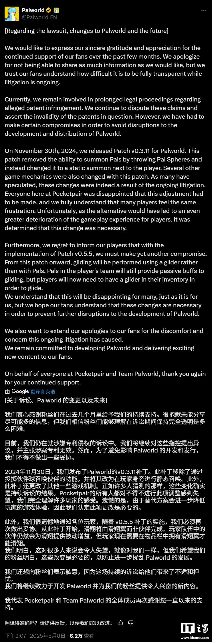 IT之家 5 月 8 日消息,《幻兽帕鲁》游戏官方 X 账号今日发布声明,感谢玩家们在过去数月对《幻兽帕鲁》的支持,并就未能充分说明近况进行了致歉。