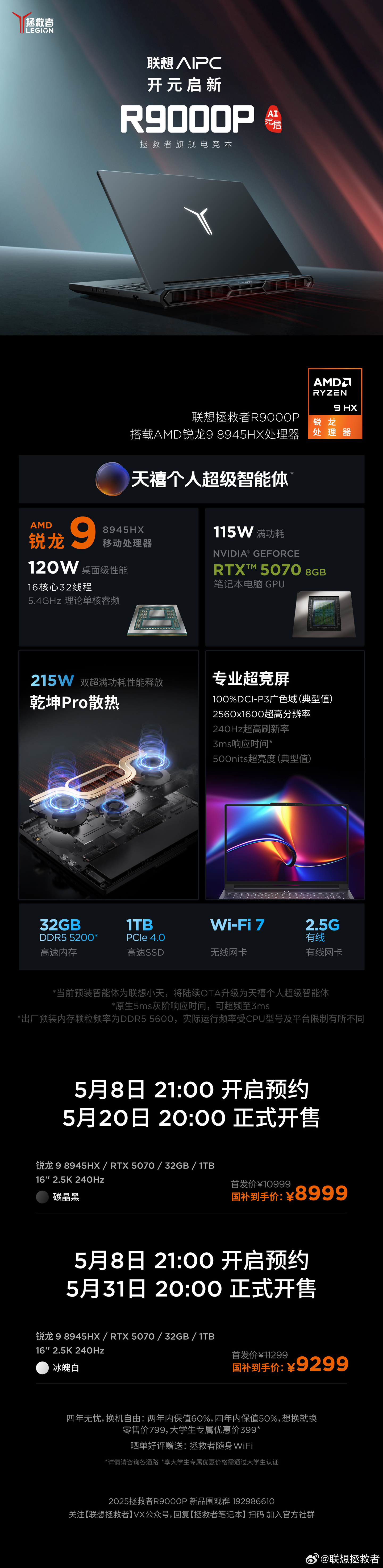 锐龙 9 8945HX + RTX 5070 + 32GB + 1TB 售价 10999 元起,国补后 8999 元起