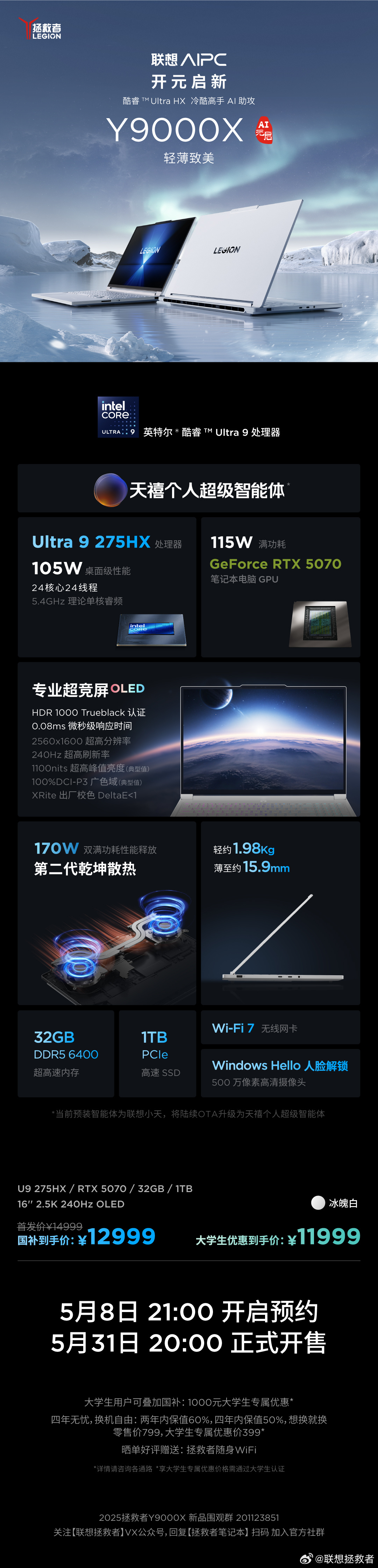 Ultra 9 275HX + RTX 5070 + 32GB + 1TB 售价 14999 元,国补后 12999 元