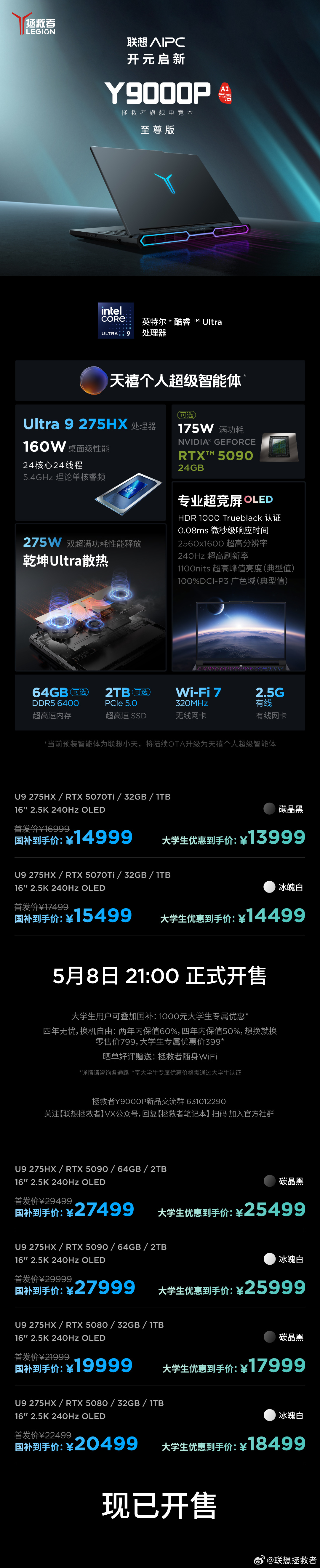 Ultra 9 275HX + RTX 5080 + 32GB + 1TB 售价 21999 元起,国补后 19999 元起