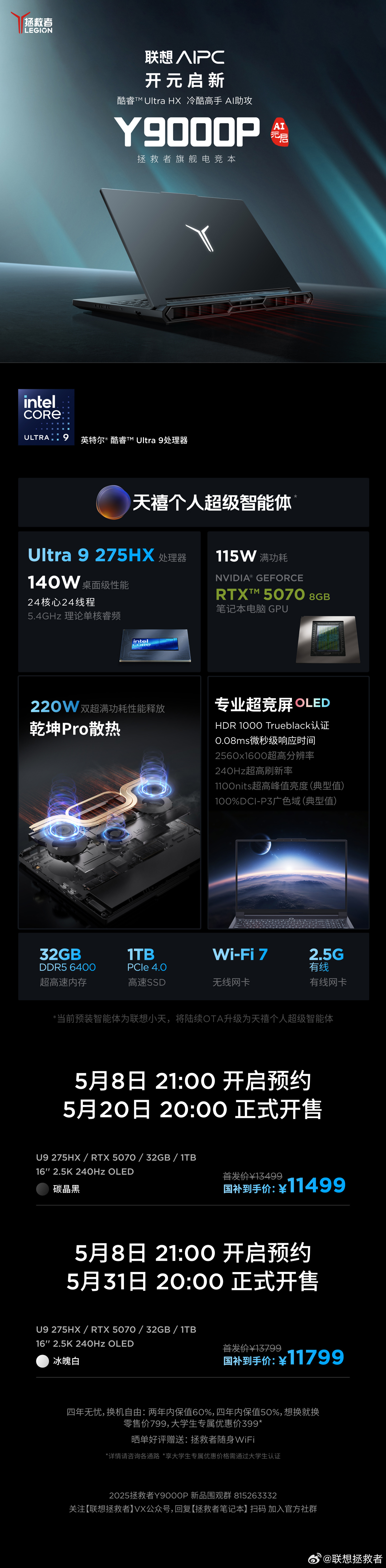 Ultra 9 275HX + RTX 5070 + 32GB + 1TB 售价 13499 元起,国补后 11499 元起