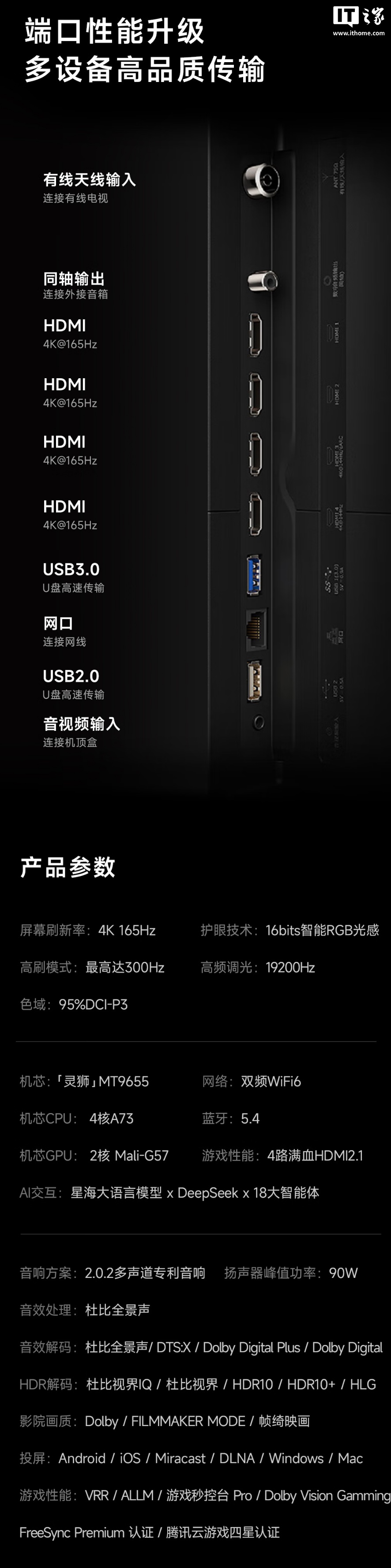 海信 Vidda 贴贴壁纸电视配有 4K 165Hz 屏,最高可达 300Hz,色域可达 95% DCI-P3;搭载“灵狮”MT9655 处理器(IT之家注:4 核 A73)、4GB + 64GB 存储(100 英寸为 128GB),以及 4 路满血 HDMI 2.1 接口。