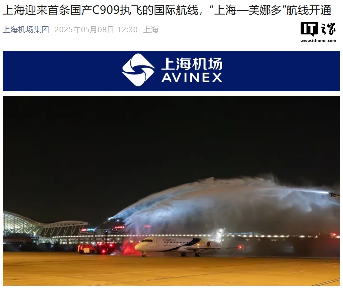 IT之家 5 月 9 日消息,据上海机场集团官方消息,5 月 7 日 22 时 40 分,由国产支线飞机 C909 执飞的印尼翎亚航空 8B101 航班(印尼美娜多 — 上海浦东)首次降落在浦东机场,穿过象征民航最高礼遇的“水门”,上海往返印尼美娜多的国际航线正式开通,这也是 C909 飞机目前最长距离的商业运营,航程超 3300 公里。
