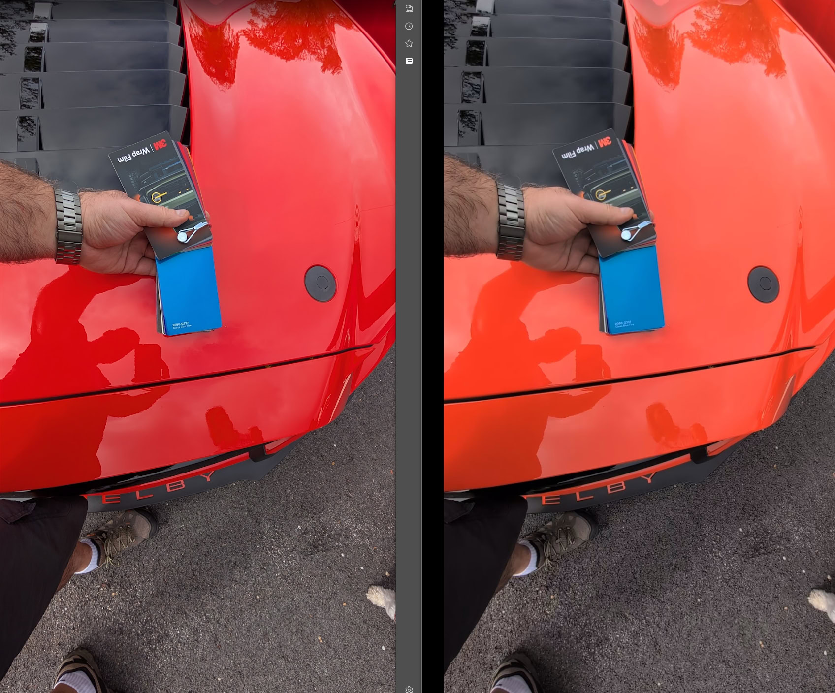 一位 Pixel 9 Pro 用户以拍摄橙色 Shelby 汽车为例,展示了处理后的照片(左侧)颜色失真,而取景器预览(右侧)则显示正确色调。用户表示,拍摄瞬间照片看似正常,但进入图库后仅一秒便被过度处理,颜色严重失衡。IT之家附上对比图如下: