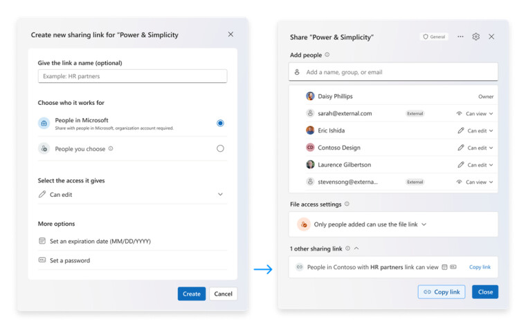在安全性方面,“hero link”默认只允许已添加至文档的人员访问。若新增人员,更新后的共享界面(UI)会标记出组织外部用户,IT 管理员还能根据企业需求自定义默认行为,灵活调整权限策略。