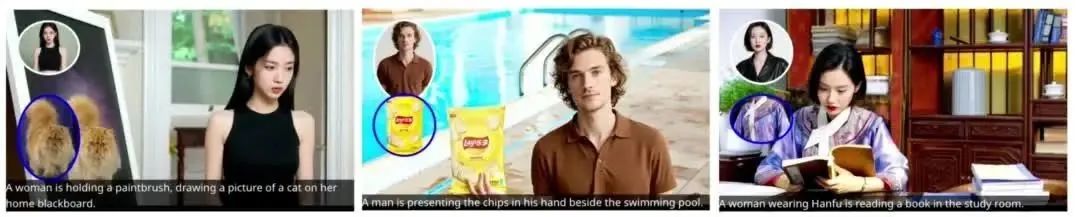 除了单主体以外,这个能力同样能实现多主体视频的生成,用户提供一张人物和一张物体的照片(比如一包薯片和一名男子的照片),并输入文字描述(比如“一名男子正在游泳池旁边,手里拿着薯片进行展示”),即可能让这两个主体按要求出现在视频里。