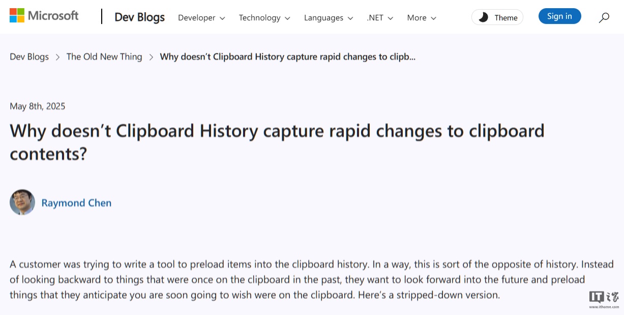 IT之家 5 月 9 日消息,据外媒 Neowin 今日报道,微软高级工程师雷蒙德・陈在微软网站的专栏《The Old New Thing》更新博文,他详细说明了 Windows 本地剪贴板与其他剪贴板管理器的不同之处,并解释了这种设计为何有益。