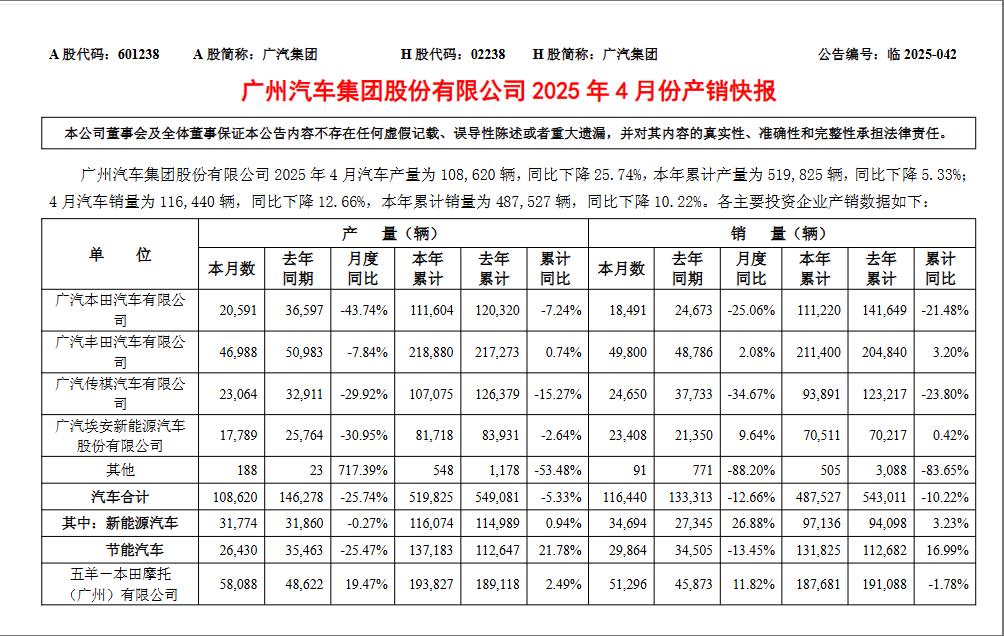 IT之家 5 月 9 日消息,广汽集团今日发布公告,2025 年 4 月汽车产量为 10.86 万辆,同比下降 25.74%,本年累计产量为 51.98 万辆,同比下降 5.33%。