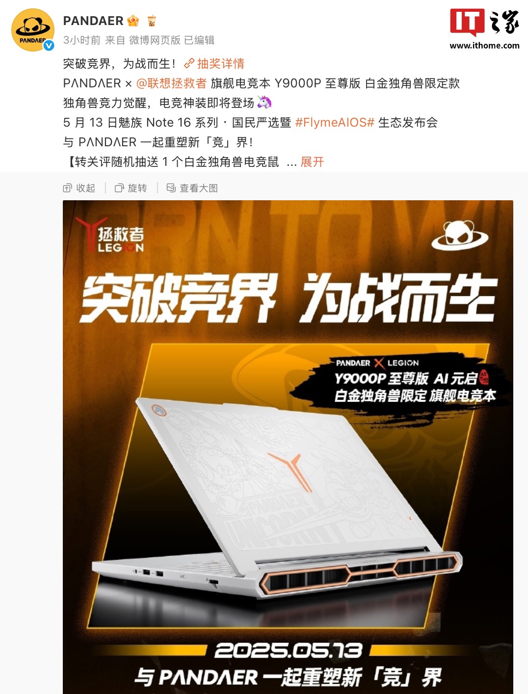 IT之家 5 月 9 日消息,魅族 PANDAER 宣布与联想合作推出一款拯救者 Y9000P 至尊版 AI 元启白金独角兽限定电竞本,可以看作是普通版笔记本换上“灵龙限定涂装”,将于 5 月 13 日与魅族 Note 16 系列手机同台登场。