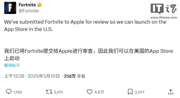 IT之家 5 月 10 日消息,Epic Games 官方今日发布声明,宣布已按承诺向美国区 App Store 提交《堡垒之夜》上架申请。