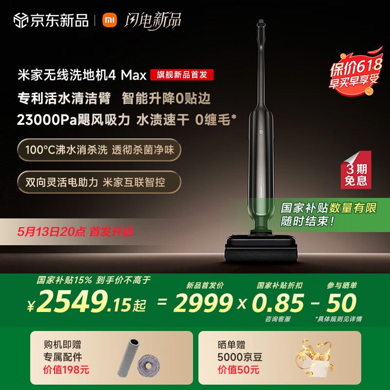 IT之家 5 月 10 日消息,小米米家无线洗地机 4 Max 现已上架京东平台并开启预约,新品配备活水贴边清洁臂、23000Pa 吸力,5 月 13 日 20:00 开售,首发价 2999 元,国补价 2549.15 元起。