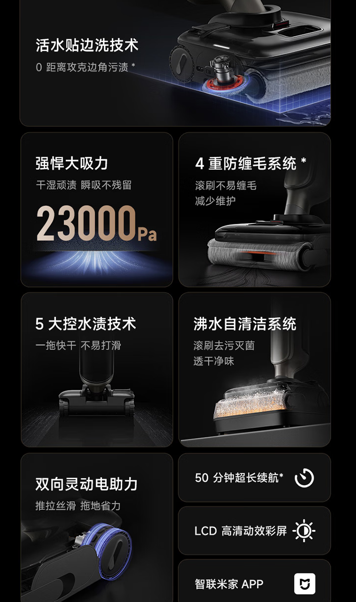 主电机吸力达 23000Pa,最大吸入功率可达 134AW,配合滚刷 450 次 / 分快速擦洗,支持 5 种清洁模式,勾、挤、吸、收 4 重防缠毛系统。新增木地板模式,地面即洗快干不易打滑。