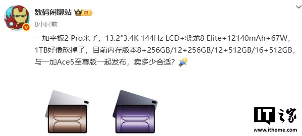 今日早些时候,博主 @数码闲聊站 放出了一加平板 2 Pro 主要参数信息,IT之家汇总如下: