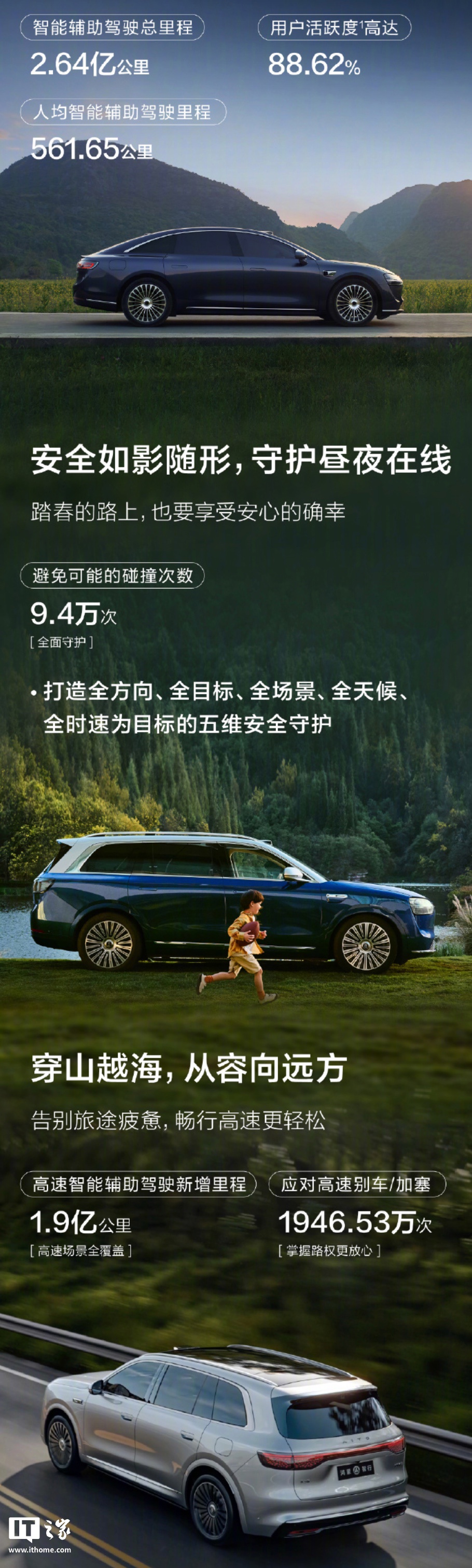 IT之家 5 月 10 日消息,据“鸿蒙智行”官方微博,鸿蒙智行现已发布 4 月智能辅助驾驶报告,本月智能辅助驾驶总里程达到 2.64 亿公里、用户活跃度达到 88.62%,人均智能辅助驾驶里程达到 561.65 公里。