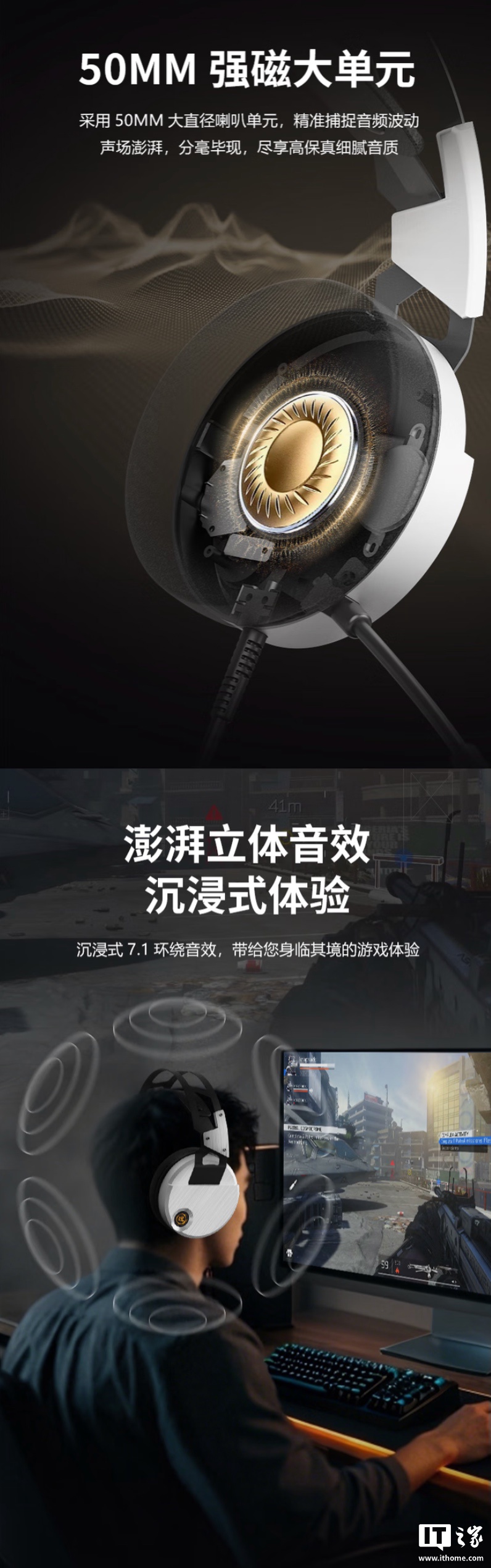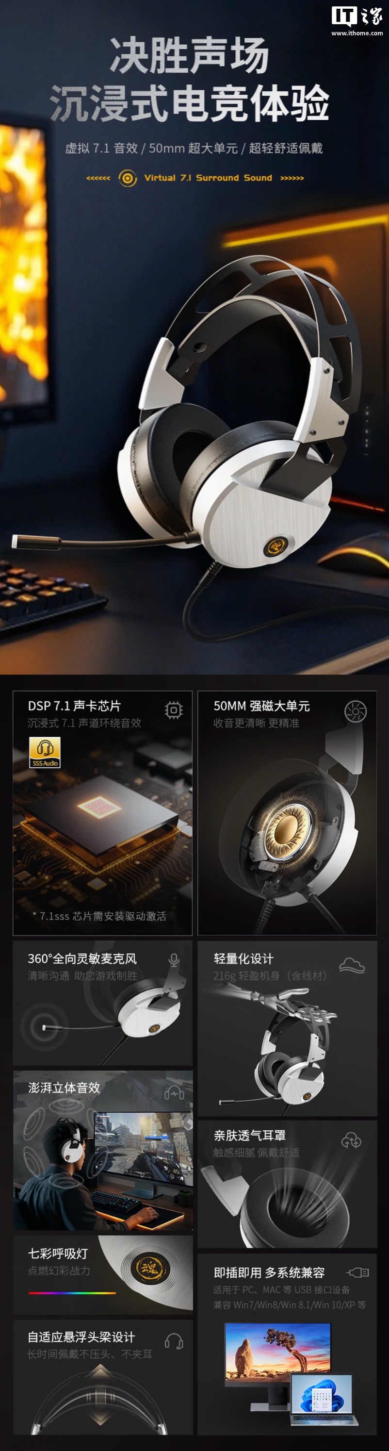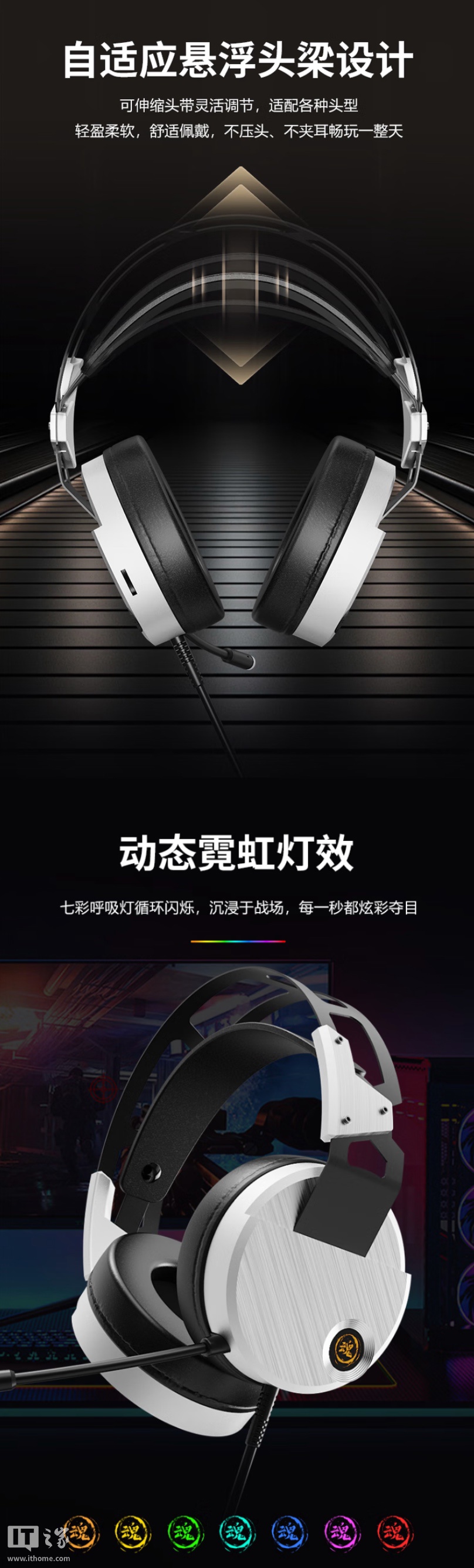 这款耳机可选黑银双色,耳机提供亲肤透气耳罩,拥有自定义悬浮头梁,提供动态呼吸灯效。耳机配备 50mm 动圈单元,提供沉浸式 7.1 环绕音效,频响范围 20Hz-20Khz,同时搭载有 360 度全向灵敏麦克风。