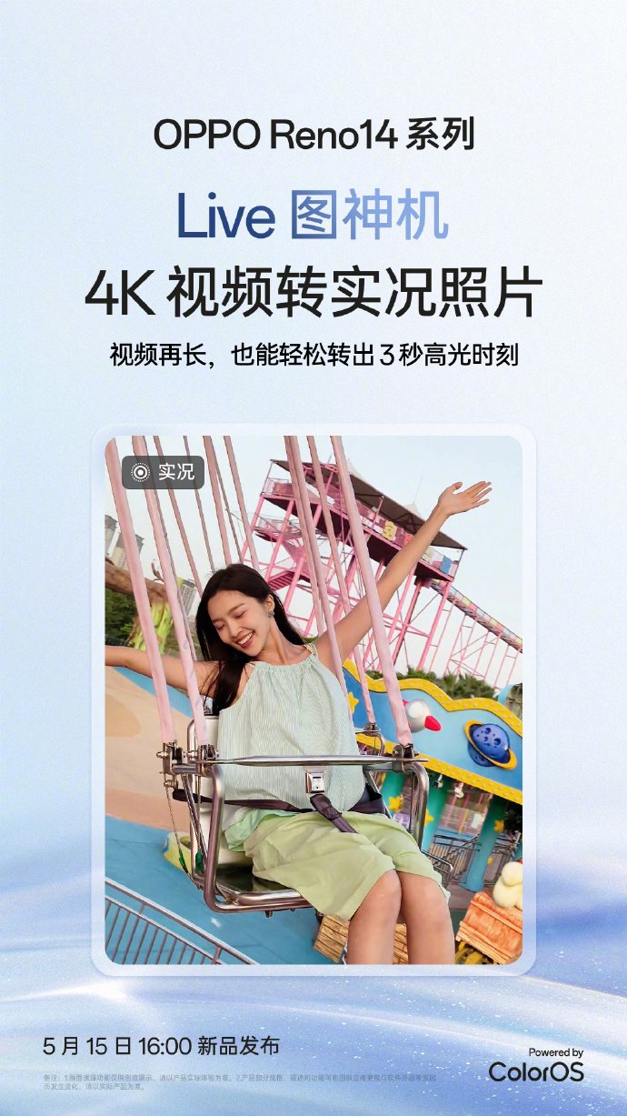 IT之家 5 月 11 日消息,OPPO Reno14 系列手机将于 5 月 15 日 16:00 发布,官方预热称新机支持 4K 视频转实况照片功能。