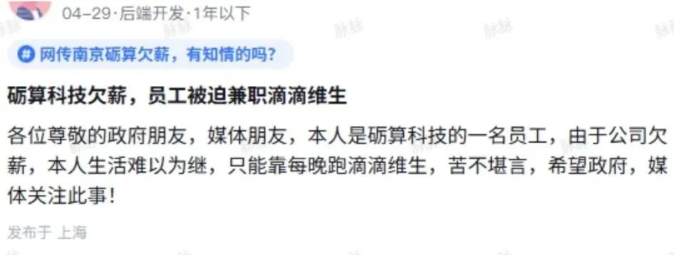 该平台信息显示,一名砺算科技后端研发人员发帖称,该公司已连续两个月暂停全员薪酬。