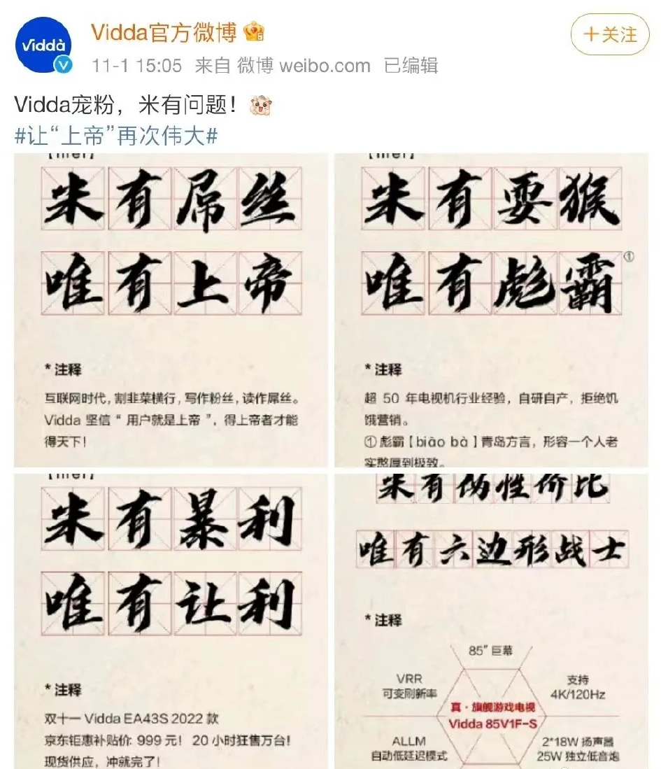 IT之家查询获悉,Vidda 是海信旗下的时尚科技品牌,推出了多款电视 & 智能投影产品。该品牌曾在 2021 年发布多张海报,文案提到“米【mei】有问题”、“米【mei】有屌丝,唯有上帝”、“米【mei】有耍猴,唯有彪霸”、“米【mei】有暴利,唯有让利”、“米【mei】有伪性价比,唯有六边形战士”引发广泛议论。