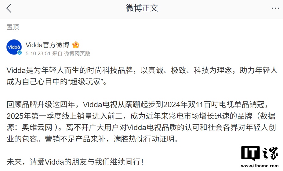 IT之家 5 月 12 日消息,Vidda 官方微博 5 月 10 日晚发布声明:
