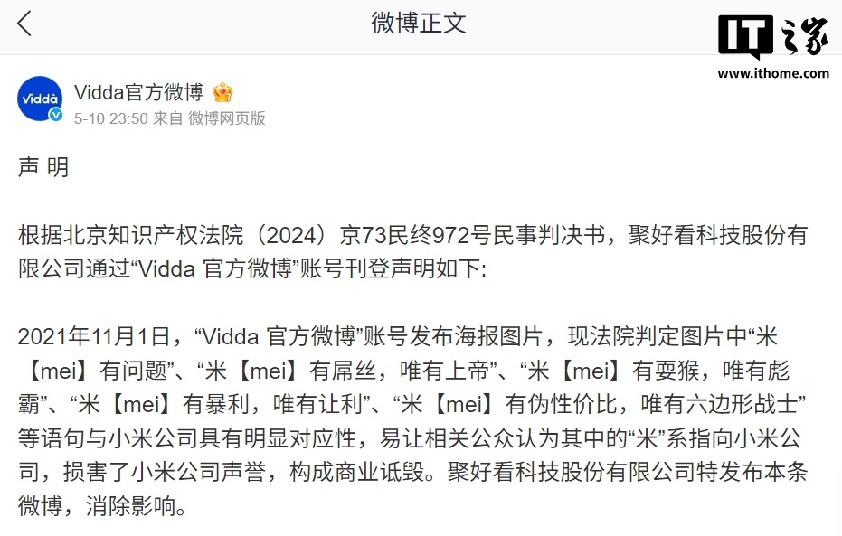 2021 年 11 月 1 日,“Vidda 官方微博”账号发布海报图片,现法院判定图片中“米【mei】有问题”、“米【mei】有屌丝,唯有上帝”、“米【mei】有耍猴,唯有彪霸”、“米【mei】有暴利,唯有让利”、“米【mei】有伪性价比,唯有六边形战士”等语句与小米公司具有明显对应性,易让相关公众认为其中的“米”系指向小米公司,损害了小米公司声誉,构成商业诋毁。聚好看科技股份有限公司特发布本条微博,消除影响。