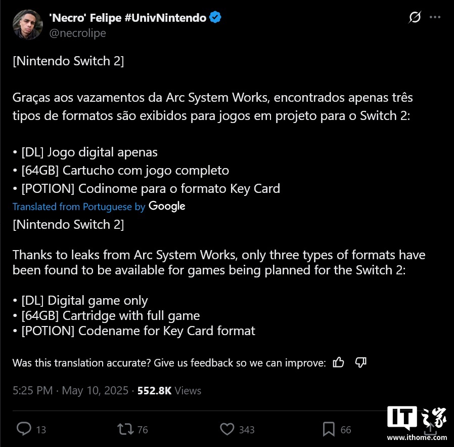 IT之家 5 月 12 日消息,消息人士 NecroLipe 昨日于 X 平台上表示,任天堂 Switch 2 游戏机的实体卡带除“游戏密钥卡”之外,只有 64GB 容量可选。