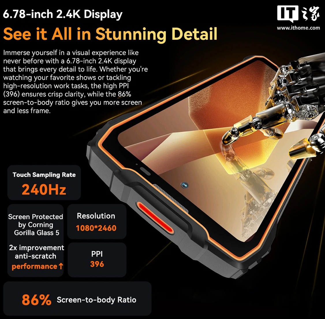根据 Blackview 官方介绍,该手机通过了 IP68 和 IP69 认证,可防尘、防水;重量为 360 克(12.6 盎司),屏幕尺寸为 6.78 寸,分辨率为 2460*1080,刷新率为 120Hz。