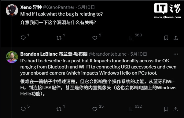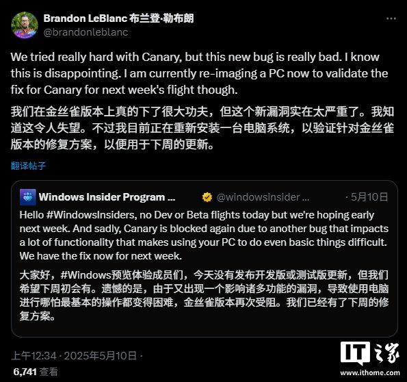 IT之家注意到,随后微软 Windows Insider 计划团队的高级项目经理 Brandon LeBlanc 对此次延迟的原因进行了解释。他略带歉意地指出,此次延迟是由于一个新出现的“非常严重”的漏洞所导致的。当社区用户进一步询问该漏洞的详细情况时,LeBlanc 表示,该漏洞会对整个操作系统的功能产生广泛影响,涉及蓝牙、Wi-Fi、USB 以及摄像头等多个关键功能模块。