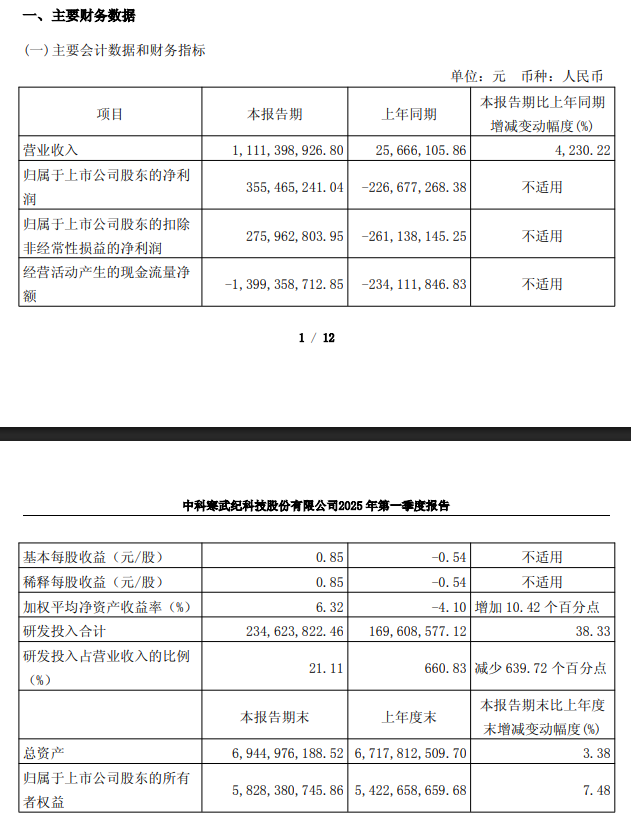 IT之家注意到,寒武纪 4 月 18 日发布公告:今年第一季度营收为 11.11 亿元,同比增长 4230.22%;净利润为 3.55 亿元,而去年同期净亏损 2.27 亿元;研发投入占比 21.11%。