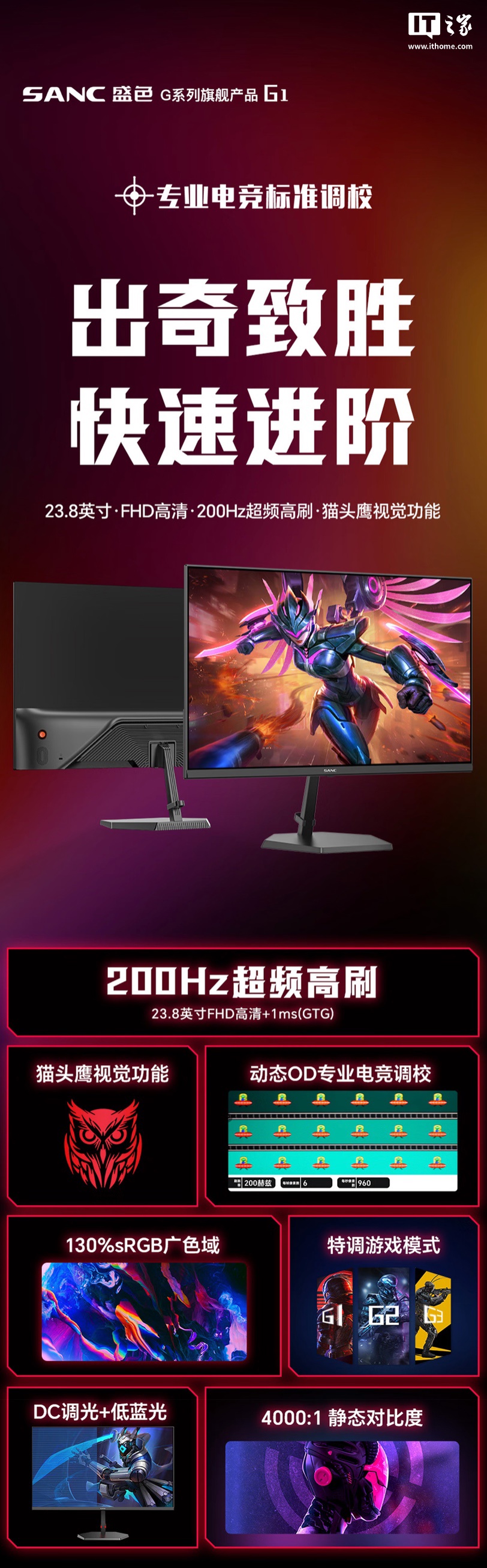 IT之家 5 月 12 日消息,盛色现已在京东上架一款型号为“G1”的 23.8 英寸显示器,这款显示器主打“1080P 200Hz 超频”,定价为 459 元。
