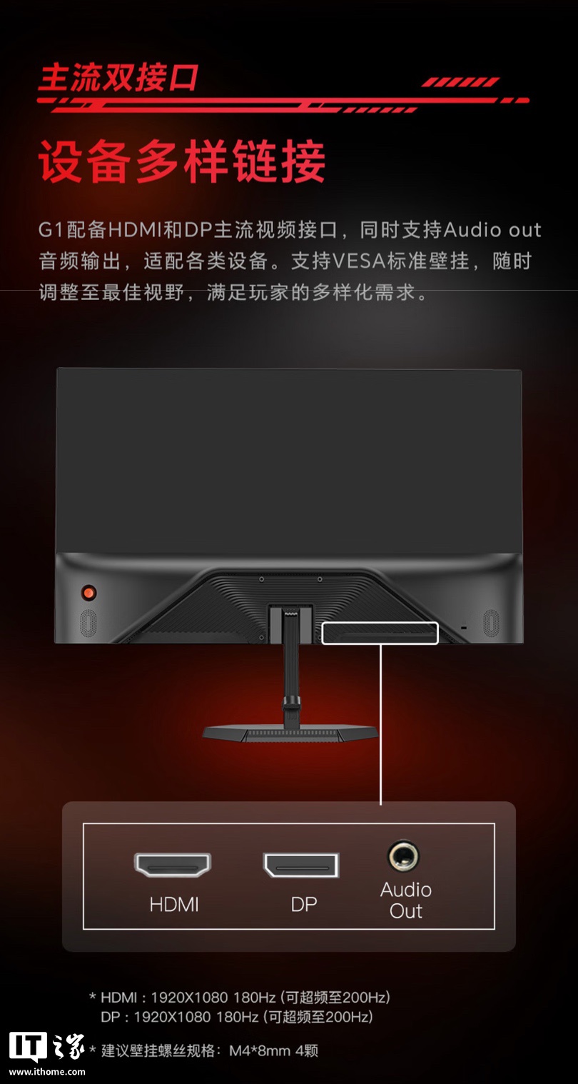 这款显示器支架不支持调节,不过显示器本体支持 VESA 75x75mm 壁挂,提供 HDMI 和 DP 接口(均支持 200Hz)。