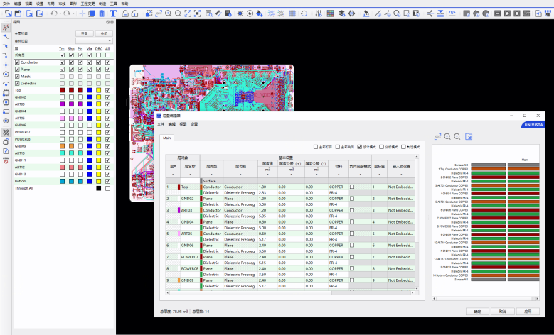PCB 层数不受限制,pin 数高达百万规模。满足复杂大规模电子系统的设计需求,同时保证高性能与高可靠性功能。UniVista Archer PCB EDA 软件拥有高效灵活的铜皮设计,简单易用的走线推挤功能,具有丰富的规则约束管理和严谨的 DRC 检查,支持电子系统设计全流程上完整的交换数据输入输出,支持输出经过验证的光绘生产数据和打孔数据等。