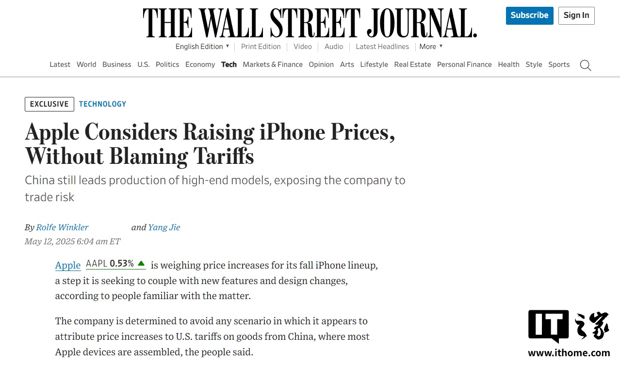 IT之家 5 月 12 日消息,《华尔街日报》今日援引知情人士消息称,苹果正考虑提高今秋发布的 iPhone售价。