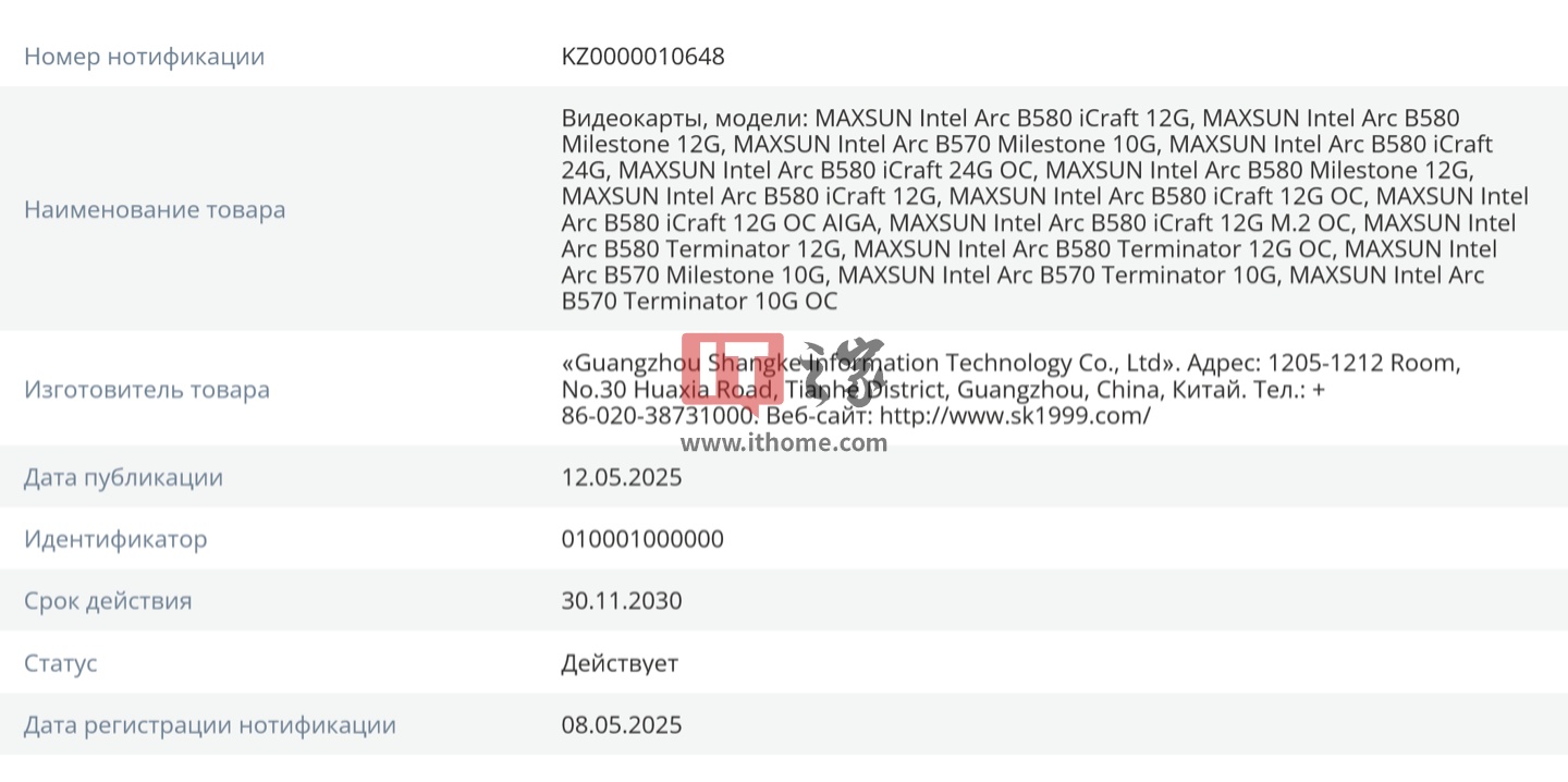 IT之家 5 月 13 日消息,商科集团近日向 ECC 进行了多笔硬件产品的型号注册,除之前提到的英伟达 GeForce 显卡外,也包含铭瑄从 "Battlemage" 世代开始涉及的英特尔锐炫显卡。