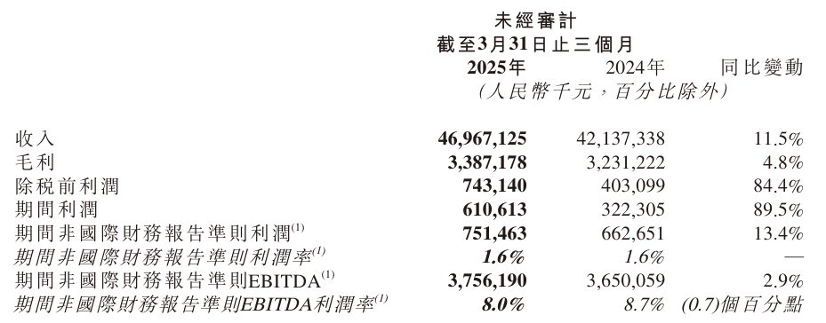 外包成本主要包括第三方运输公司、快递公司及其他服务供应商就分拣、运输、配送及劳务外包服务所收取的费用,由截至 2024 年 3 月 31 日止三个月的人民币 145 亿元增加 17.8% 至 2025 年同期的人民币 171 亿元,主要受业务增长而需要更多外包服务所带动。