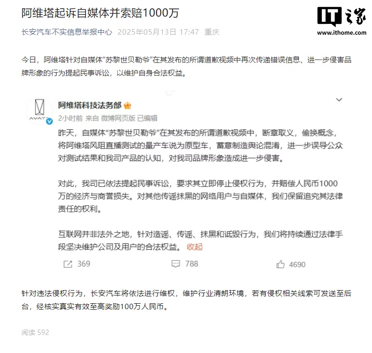 IT之家 5 月 13 日消息,今日,阿维塔针对自媒体“苏黎世贝勒爷”在其发布的所谓道歉视频中再次传递错误信息、进一步侵害品牌形象的行为提起民事诉讼。