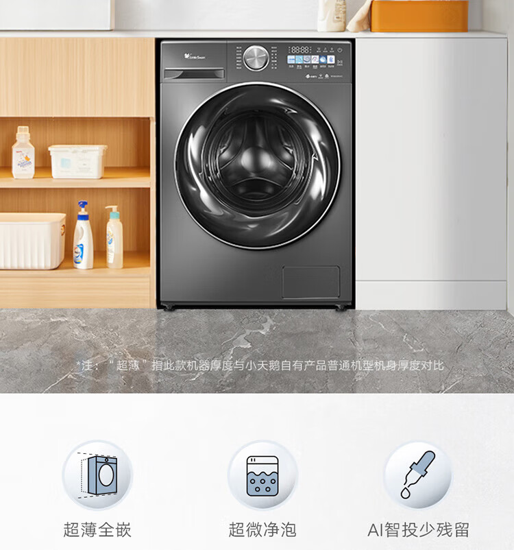 据介绍,小天鹅・小乌梅系列 TG100RVIC 滚筒洗衣机搭载 BLDC 变频电机,支持超微净泡技术,标称洗净比可达 1.10,允许两侧 15mm 微缝嵌入,可完全嵌入 600mm 家装行业主流柜体。